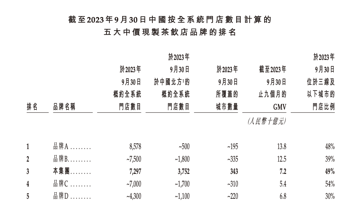 招股书中援引灼识咨询数据显示,截至2023年9月30日,沪上阿姨拥有门店7297家,覆盖全国343个城市,2023年前九个月GMV为72亿元。相比之下,门店数在7500家左右的茶百道,同期GMV却有125亿元,是沪上阿姨的1.7倍。而排在第一,总门店数8578家的古茗,在门店数比沪上阿姨多出1281家后,其同期GMV为138亿元,是沪上阿姨的1.9倍。