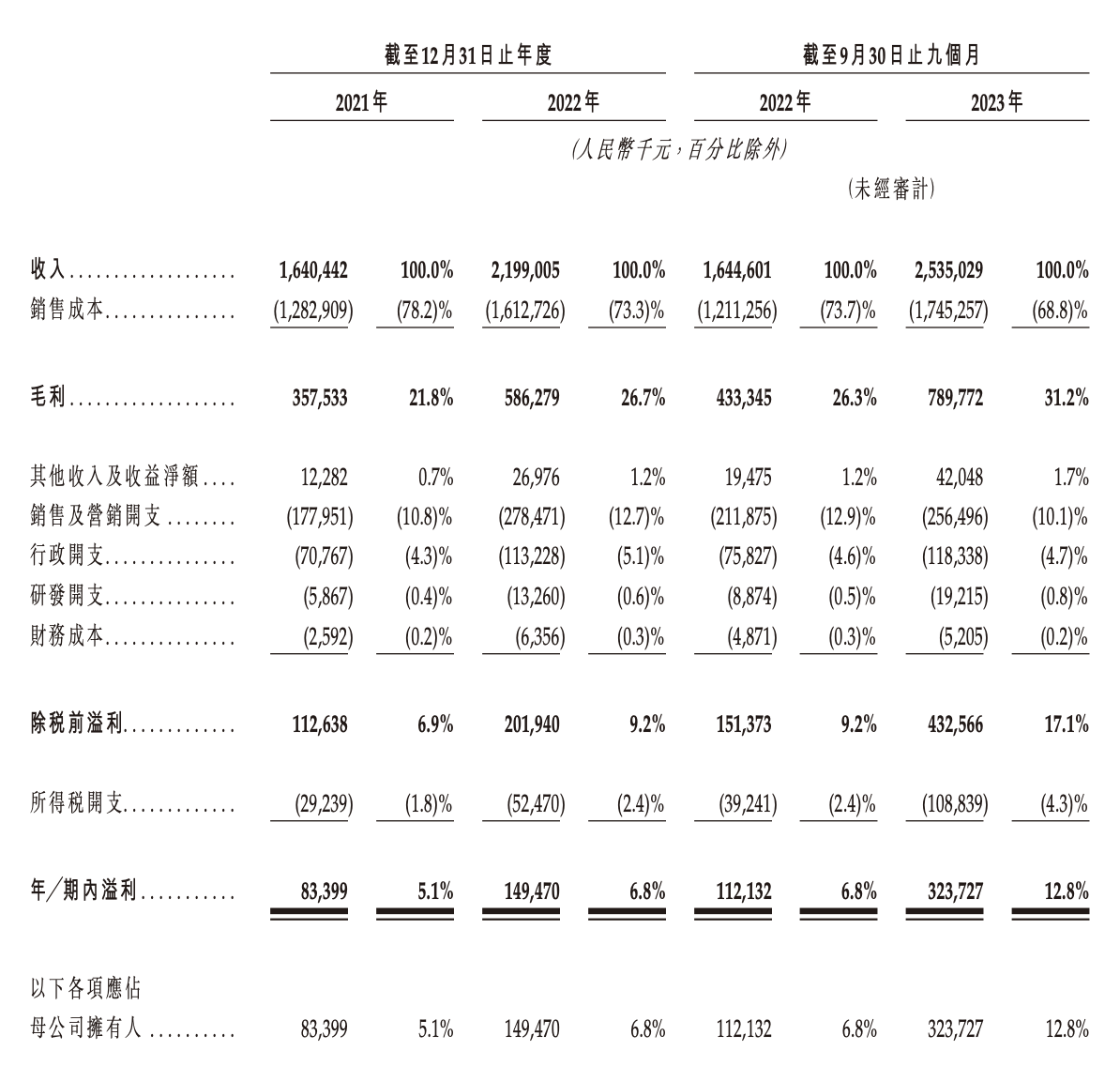 招股书显示,沪上阿姨于2013年在上海开出第一家门店,主打以血糯米奶茶为代表的“五谷奶茶”。2019年,沪上阿姨调整产品类别,新增水果茶种类。随着品牌发展,沪上阿姨近三年来营收和净利都大幅增长。招股书显示,2021年、2022年以及2023年前九个月,沪上阿姨营收分别为16.40亿元、21.99亿元和25.35亿元,2022年及2023年前九个月同比增速分别为34.05%和54.14%;净利润分别为8339.9万元、1.49亿元和3.24亿元,同比增速分别为79.22%和188.70%。