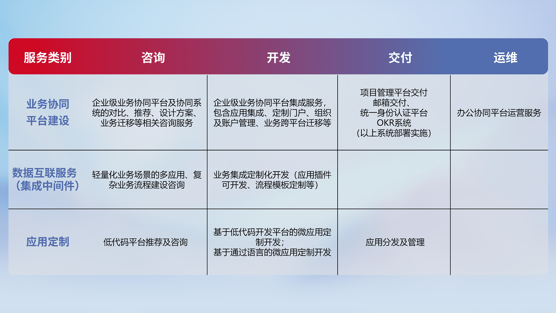 针对钉钉、、、企微、、IDaas等平台级产品提供产品的规划、、、、方案、、交付、、、定制化开发等服务,,实现如统一协同办公、、、、智能客户服务、、、混合会议管理、、、、智能数据查询、、、、等业务场景,,,,实现数字化转型。。。。