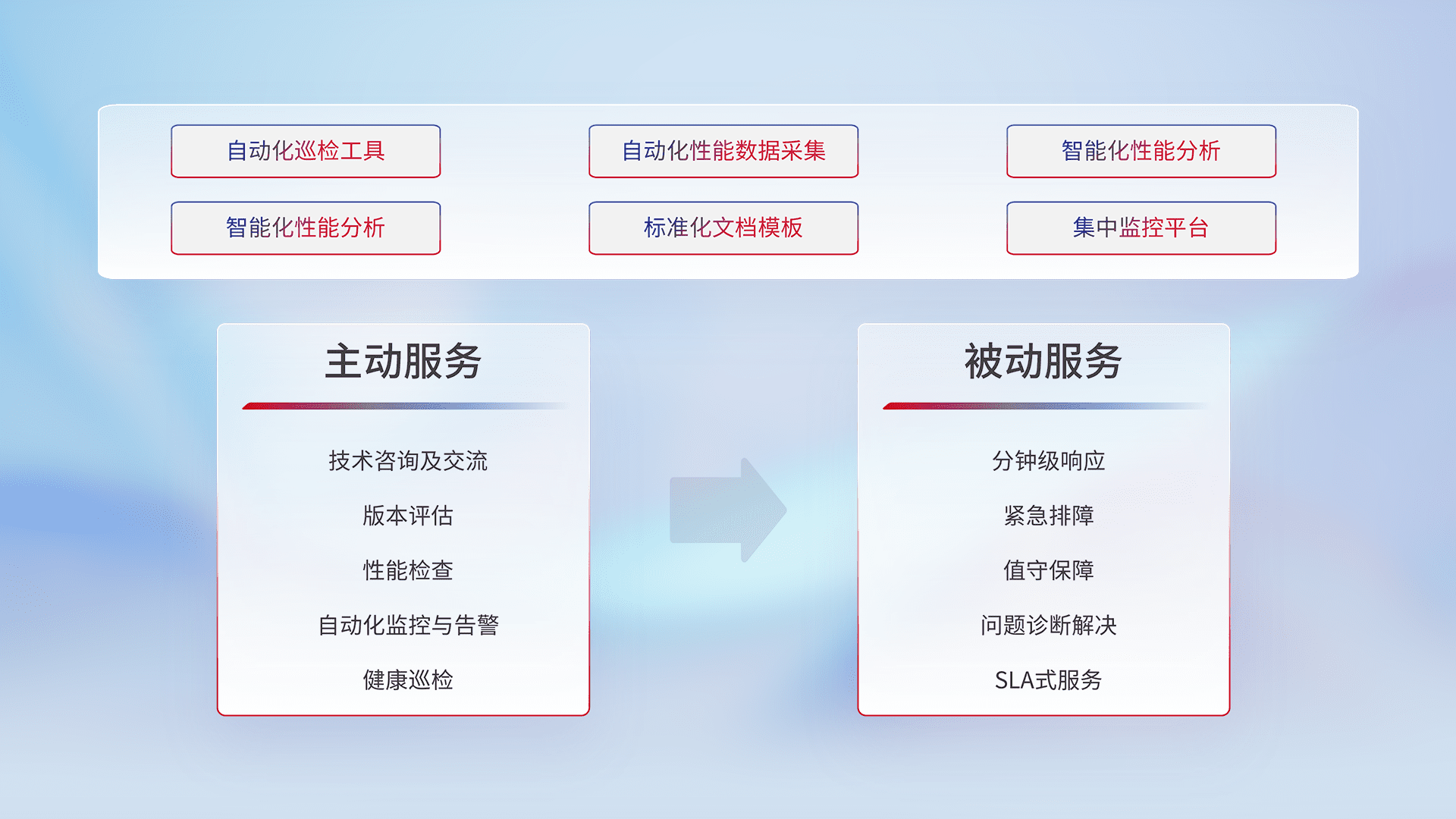 智能化工具和标准化文档,,,,保障服务质量,,,提供主动服务(包含技术咨询、、、版本评估、、性能检查、、、自动化监控与告警、、、、健康巡检)和被动服务包含(分钟级响应、、紧急排障、、、值守保障、、问题诊断解决、、、SLA服务)。。。